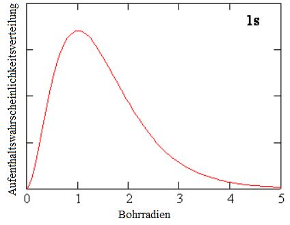 Dem ersten Elektron wird die Hauptquantenzahl n=1 zugewiesen. Dieses Elektron findet man entsprechend der Wahrscheinlichkeitsverteilung rechts im Bild am wahrscheinlichsten einen bestimmten Abstand vom Atomkern entfernt, den Bohr zuvor schon anders ausgerechnet hatte (Bohrradius). Es ist aber durchaus möglich, das Elektron näher beim Kern oder weiter weg anzutreffen. Da diese Kurve kugelsymmetrisch ist, gibt es damit eine kugelschalenähnliche Verdichtung der Wahrscheinlichkeit im Abstand von rund einem Bohrradius.
