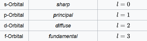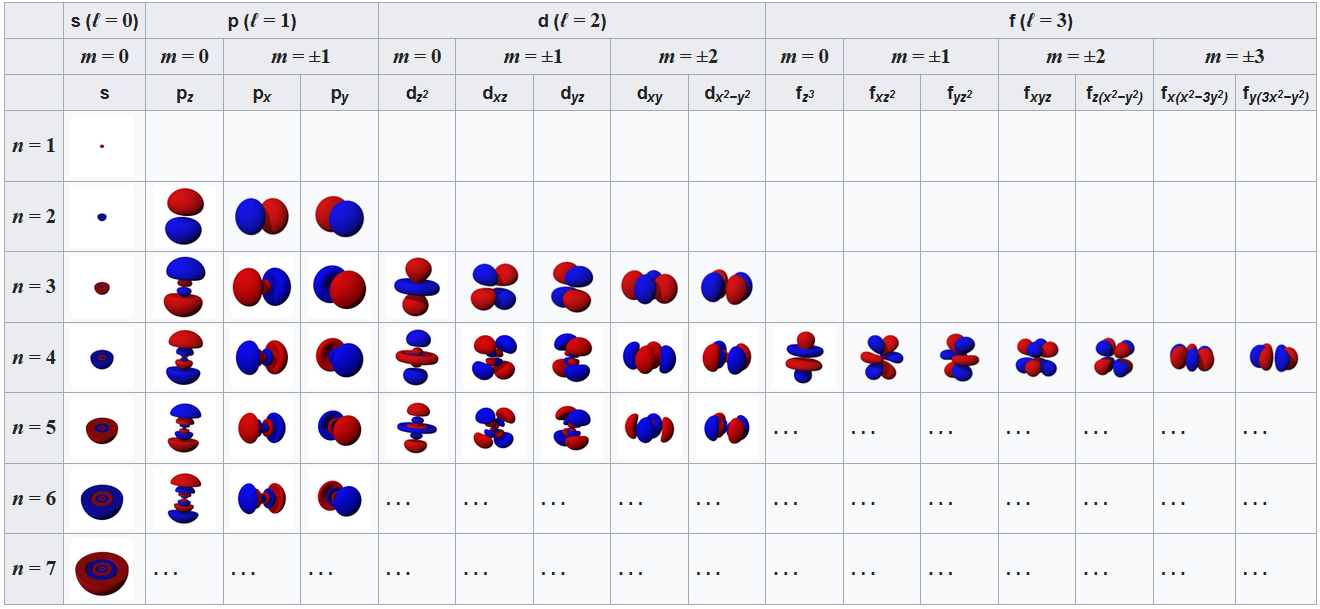 Das allererste Orbital (n=1,l=0,ml=0) ist daher das 1s-Orbital. Das nächste (n=2,l=0,ml=0) das 2s-Orbital. Diese Buchstaben kommen aus der namensgebenden optischen Form, die die Orbitale haben. s-Orbitale sind dabei kugelförmig, p-Orbitale doppelhantelförmig und f-Orbitale rosettenförmig. Die Nebenquantenzahl bestimmt die Form, während die Magnetquantenzahl zusätzlich die Ausrichtung bestimmt. Unten folgt eine optische Übersicht über verschiedene Orbitale.