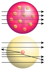 Die meisten Teilchen passierten die Goldfolie ungehindert, einige wurden abgelenkt und manche wurden sogar um mehr als 90° abgelenkt (prallten also in die Gegenrichtung zurück). Aus dem Streuversuch schloss Rutherford, dass sich die Verteilung der Streuung nur dann so ergeben konnte, wenn die positive Masse nicht gleichverteilt im Atom war, sondern sich fest in einem kleinen Punkt, dem Atomkern, konzentrierte. Rechts im Vergleich oben das Thomson-Modell, bei dem die Strahlung ungehindert passieren kann und ein Abprallen nicht sein kann. Im unteren Bild kann Rutherford mit der Annahme eines positiven Atomkerns die Messergebnisse erklären.
