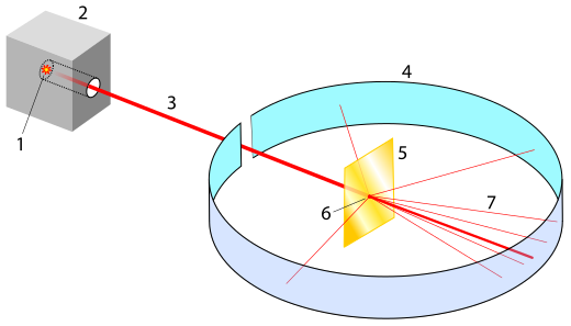 Trotz der fehlenden Erklärung für die Spektrallinien, war das Modell von Thomson das bisher forgeschrittenste Atommodell. 1909 führte jedoch Ruthford ein Experiment durch, das für ein Umdenken sorgte. Wie in nebenstehender Abbildung gab er ein radioaktives Element (1) in eine Bleiabschirmung (2), das die radioaktive Strahlung (3) durch einen Strahl durchlässt. Diese Alpha-Teilchen treffen in einem Punkt (6) auf eine dünne Goldfolie (5). Manche Teilchen werden abgelenkt (7) und treffen auf einen Schirm (4).