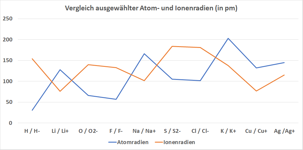 In der Grafik unterhalb wird der Größenunterschied einiger ausgewählter Atomradien zu ihren entsprechenden Ionenradien angeführt. Für detailliertere Darstellungen, insbesondere bezüglich der auch hier vorliegenden Periodizität der Radien, siehe: Weiterführenden Links.