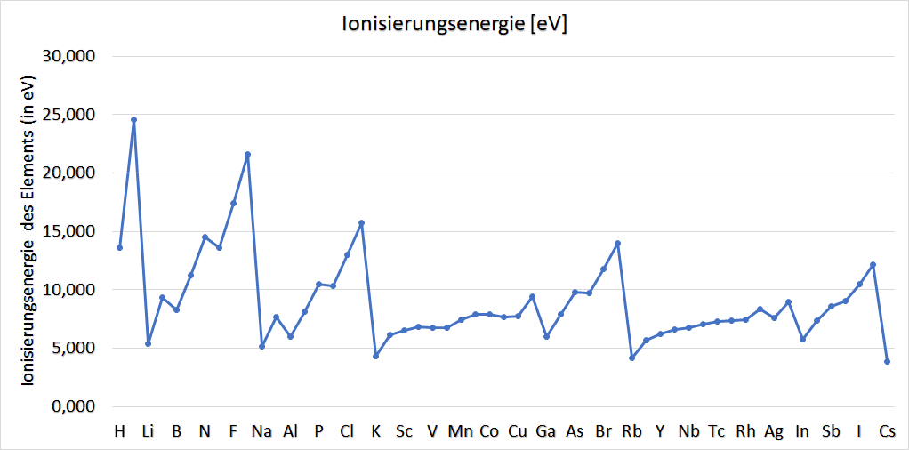 In der Grafik unterhalb sind die ersten Ionisierungsenergien aufgetragen. Würde man weiter gehen und das dabei erhaltene Kation nochmals ionisieren, spräche man von der zweiten Ionisierungsenergie usw., wobei diese Energie stetig zunimmt.