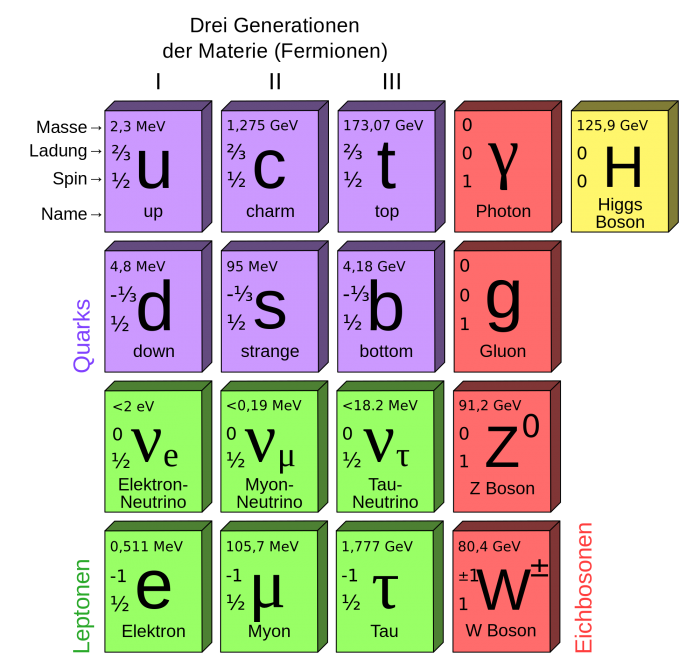 Insgesamt kennen wir also 6 Quarks und 6 Leptonen (sowie deren jeweilige 6 Anti-Quarks und 6 Anti-Teilchen) als elementare Bausteine der Materie.